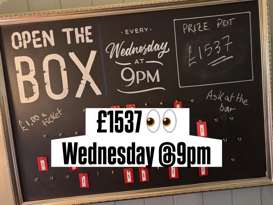 🎉 Open the Box every Wednesday at 9PM! 💷 Current prize fund: £1537 🎟️ Grab your ticket from the bar for just £1 🔐 Can you crack the code and win the cash? Don’t miss your chance!